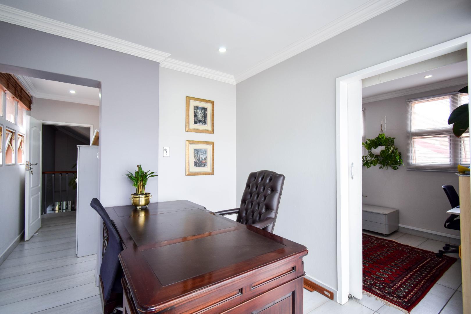 This beautiful residence, features four spacious bedrooms and three bathrooms, including two en-suite, designed to provide maximum comfort and privacy. The master suite is a true retreat, complete with a vanity area and direct access to the lush, landscaped garden and patio. The ground floor accommodates three of the bedrooms and two of the bathrooms, while the fourth bedroom, with its en-suite bathroom, is located upstairs along with a versatile study or home office. This unique space can be accessed both from inside the home and directly from outside, offering the potential to convert it into a separate flatlet by adding a kitchenette.